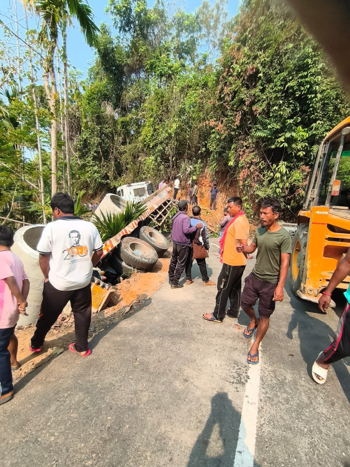 The truck was carrying the pipes, known as hume pipes, for Muktapur-Jaliakhola road construction work when it overturned in the morning at Amnohkse, which disrupted traffic between Amlarem and Muktapur.