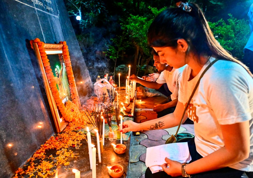 People light candles infront of the portrait of music icon late Zubeen Garg in Guwahati on Wednesday. Photo PTI