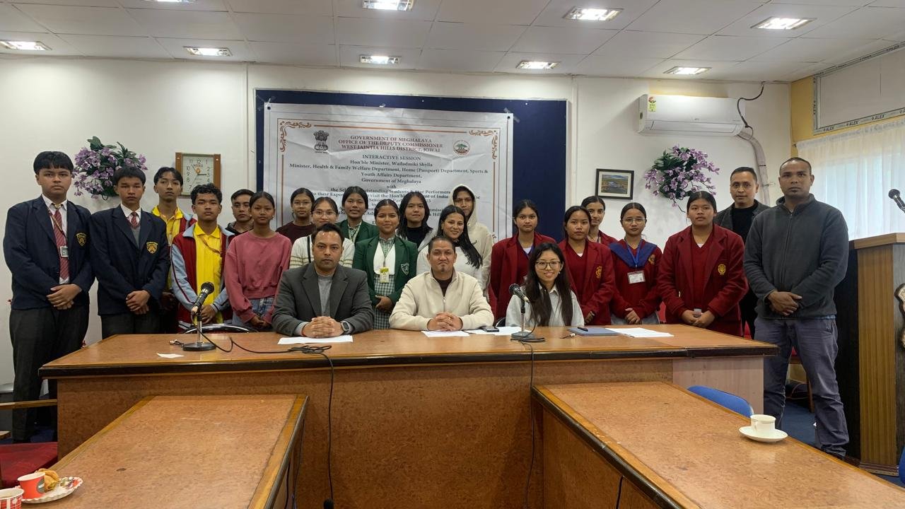 Jowai, Dec 8: Sports and Youth Affairs Minister Wailadmiki Shylla today interacted with students selected to visit President Draupadi Murmu and attend the Winter Session of Parliament as part of their exposure trip.