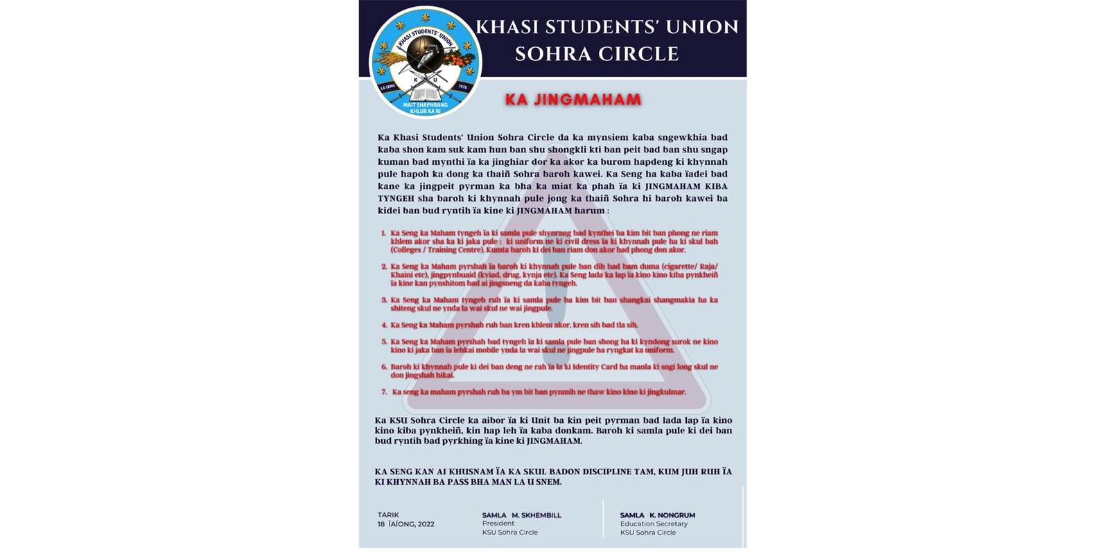 Further students are also directed to wear their identity cards everyday to school and not to get involved or cause a ruckus in Sohra.