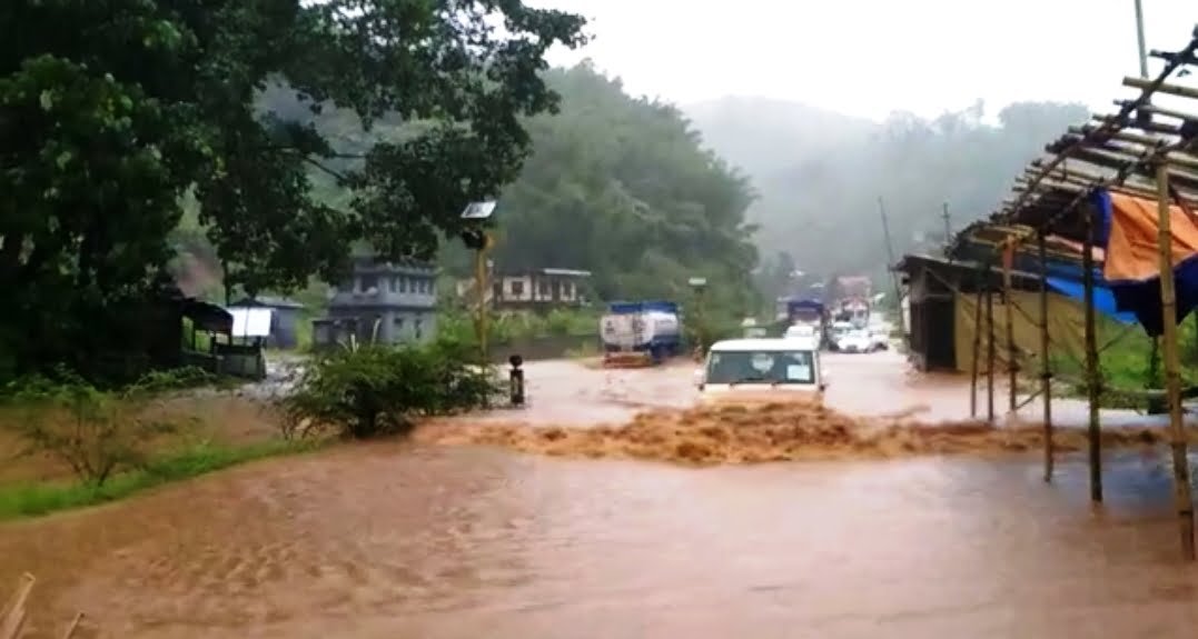 Vehicles wade through water logging National Highway-6 in Umling under Ri Bhoi district today. Vehicles stranded for many hours from 2 pm and people have blamed lack of proper drainage. Photo HP