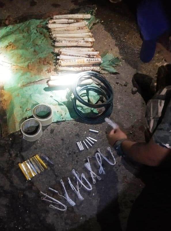 The search led to the recovery of 2.25 Kg gelatin sticks (Class-2, Division- 2, Cat- ZZ), 8 non-electric detonators, 8 electric detonators, 10 clippers, 2 cello tapes and 3 metres of safety fuse (Cordtex).