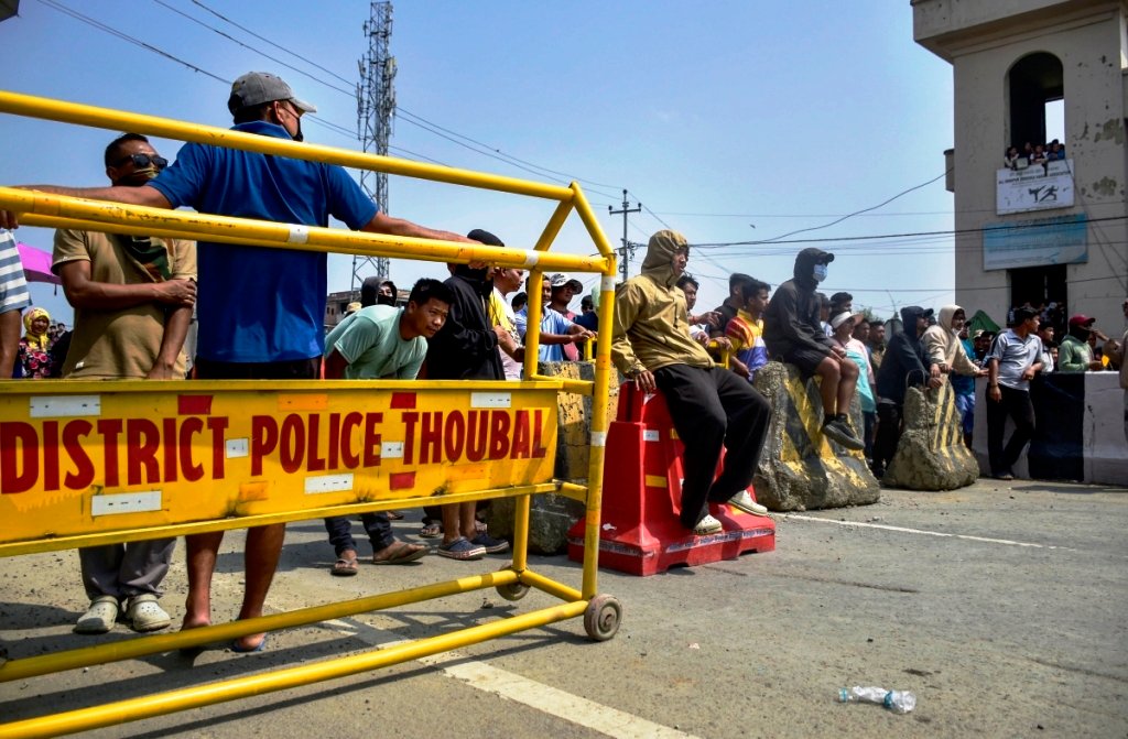 Protesters gather behind barricades and block a road at Babu Bazar in Thoubal district amid ongoing protests, reportedly ahead of an inauguration programme of a BDO office at Wangjing by Chief Minister Yumnam Khemchand Singh on Tuesday: Photo PTI