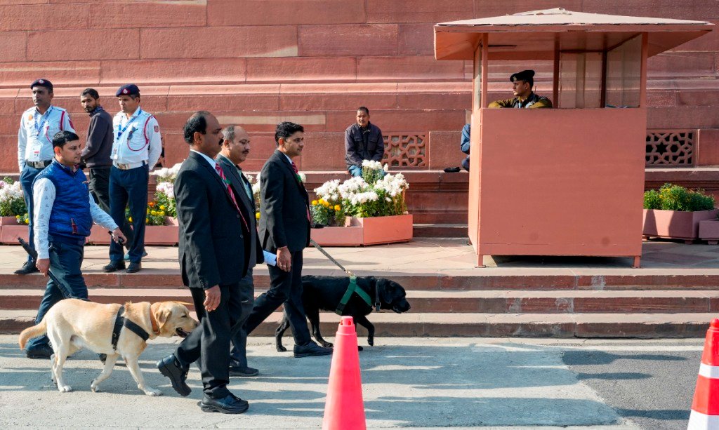Security personnel with sniffer dogs check Parliament House premises after a security breach on the anniversary of the 2001 Parliament terror attack. Photo PTI