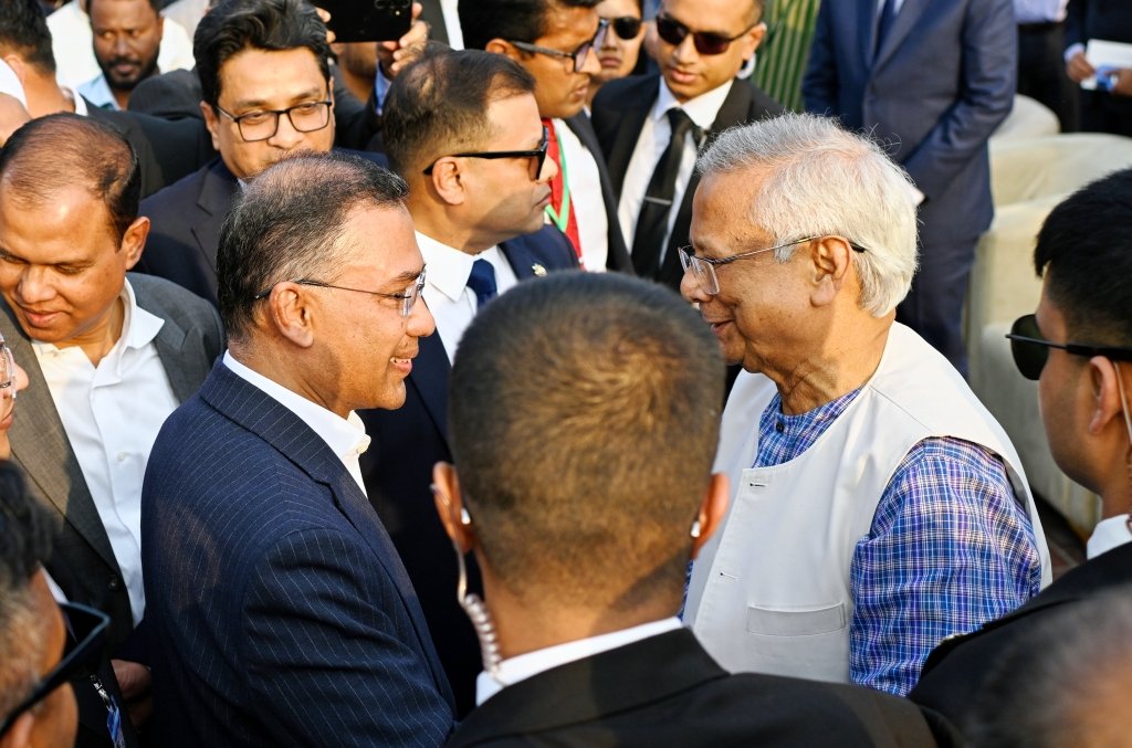 Chief Advisor of Bangladesh Professor Muhammad Yunus, right, congratulates Bangladesh's newly sworn in Prime Minister Tarique Rahman, after swearing in ceremony at the National Parliament in Dhaka, Bangladesh on Tuesday: Photo PTI