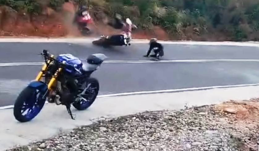 In the video, a man is seen attempting a bike stunt at on a public road at Umsawli here. While the date and time of the incident cannot be verified independently, as per the video the man on his bike attempted to bend and touched his knee on a curve and eventually fell down, causing his bike to collide with a scooty coming from the opposite direction.