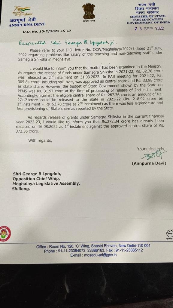 TMC MLA George Lyngdoh had written to the Union Ministry of Education regarding the delay in SSA teacher salaries. SSA teachers have been protesting the non-payment of five months’ of salaries.