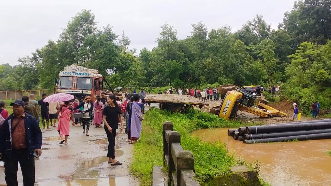A truck transporting an excavator overturned near Umket bridge in Ri Bhoi causing heavy traffic congestion along the Bhoirymbong-Kyrdem road.